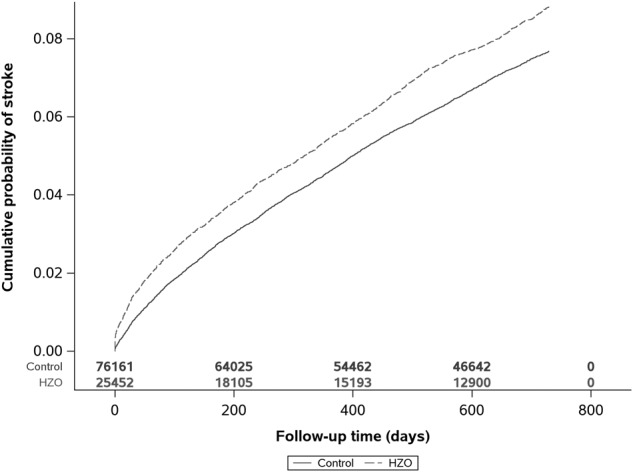 Subjects/methods: A two-step approach was taken: first a retrospective case-control study was performed, followed by a self-controlled case series (SCCS). For the case control study, cox proportional hazard regression with inverse proportional treatment weighting assessed the hazard for stroke. In the SCCS, incidence of stroke was compared prior to and after the diagnosis of HZO.