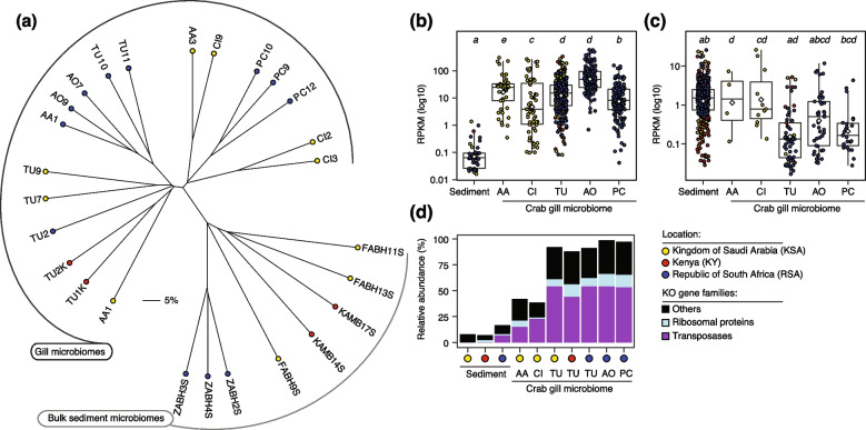 Results: Electron microscopy revealed a rod-shaped bacterial layer tightly connected to the gill lamellae of the five crab species sampled across a latitudinal gradient from the central Red Sea to the southern Indian Ocean. The gill bacterial community diversity assessed with 16S rRNA gene amplicon sequencing was consistently low across crab species, and the same actinobacterial group, namely Ilumatobacter, was dominant regardless of the geographic location of the host. Using metagenomics and metatranscriptomics, we detected that these members of actinobacteria are potentially able to convert ammonia to amino acids and may help eliminate toxic sulphur compounds and carbon monoxide to which crabs are constantly exposed.