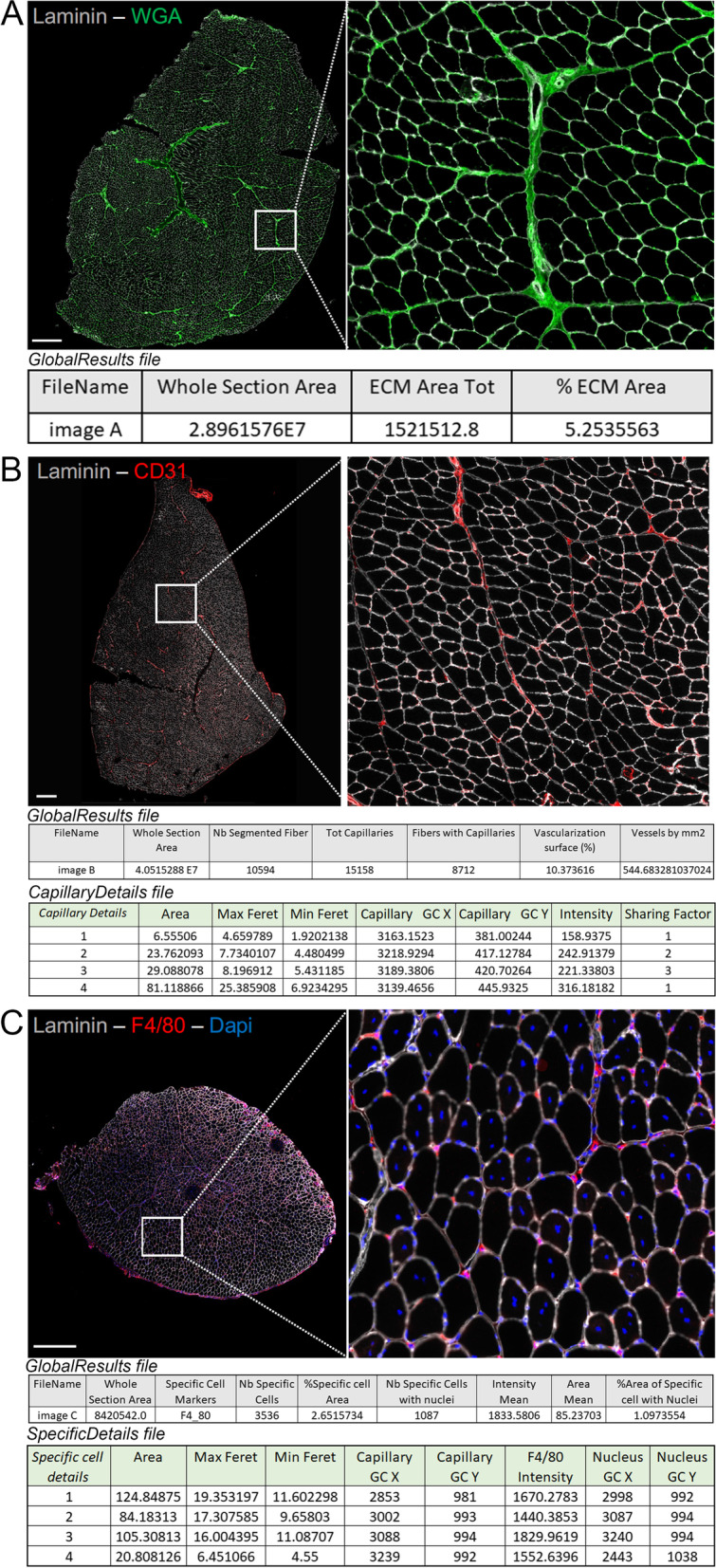 Histological analysis of skeletal muscle is of major interest for understanding its behavior in different pathophysiological conditions, such as the response to different environments or myopathies. In this context, many software programs have been developed to perform automated high-content analysis. We created MuscleJ, a macro that runs in ImageJ/Fiji on batches of images. MuscleJ is a multianalysis tool that initially allows the analysis of muscle fibers, capillaries, and satellite cells. Since its creation, it has been used in many studies, and we have further developed the software and added new features, which are presented in this article. We converted the macro into a Java-language plugin with an improved user interface. MuscleJ2 provides quantitative analysis of fibrosis, vascularization, and cell phenotype in whole muscle sections. It also performs analysis of the peri-myonuclei, the individual capillaries, and any staining in the muscle fibers, providing accurate quantification within regional sublocalizations of the fiber. A multicartography option allows users to visualize multiple results simultaneously. The plugin is freely available to the muscle science community.