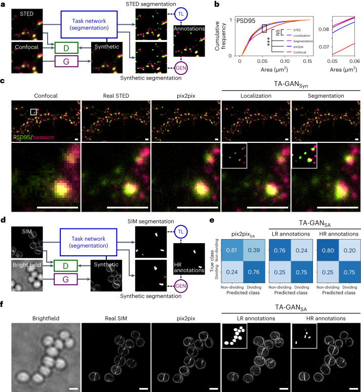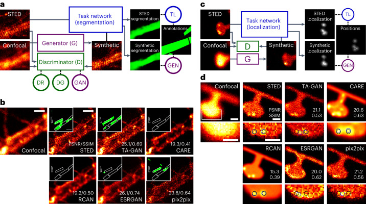 Super-resolution fluorescence microscopy methods enable the characterization of nanostructures in living and fixed biological tissues. However, they require the adjustment of multiple imaging parameters while attempting to satisfy conflicting objectives, such as maximizing spatial and temporal resolution while minimizing light exposure. To overcome the limitations imposed by these trade-offs, post-acquisition algorithmic approaches have been proposed for resolution enhancement and image-quality improvement. Here we introduce the task-assisted generative adversarial network (TA-GAN), which incorporates an auxiliary task (for example, segmentation, localization) closely related to the observed biological nanostructure characterization. We evaluate how the TA-GAN improves generative accuracy over unassisted methods, using images acquired with different modalities such as confocal, bright-field, stimulated emission depletion and structured illumination microscopy. The TA-GAN is incorporated directly into the acquisition pipeline of the microscope to predict the nanometric content of the field of view without requiring the acquisition of a super-resolved image. This information is used to automatically select the imaging modality and regions of interest, optimizing the acquisition sequence by reducing light exposure. Data-driven microscopy methods like the TA-GAN will enable the observation of dynamic molecular processes with spatial and temporal resolutions that surpass the limits currently imposed by the trade-offs constraining super-resolution microscopy.