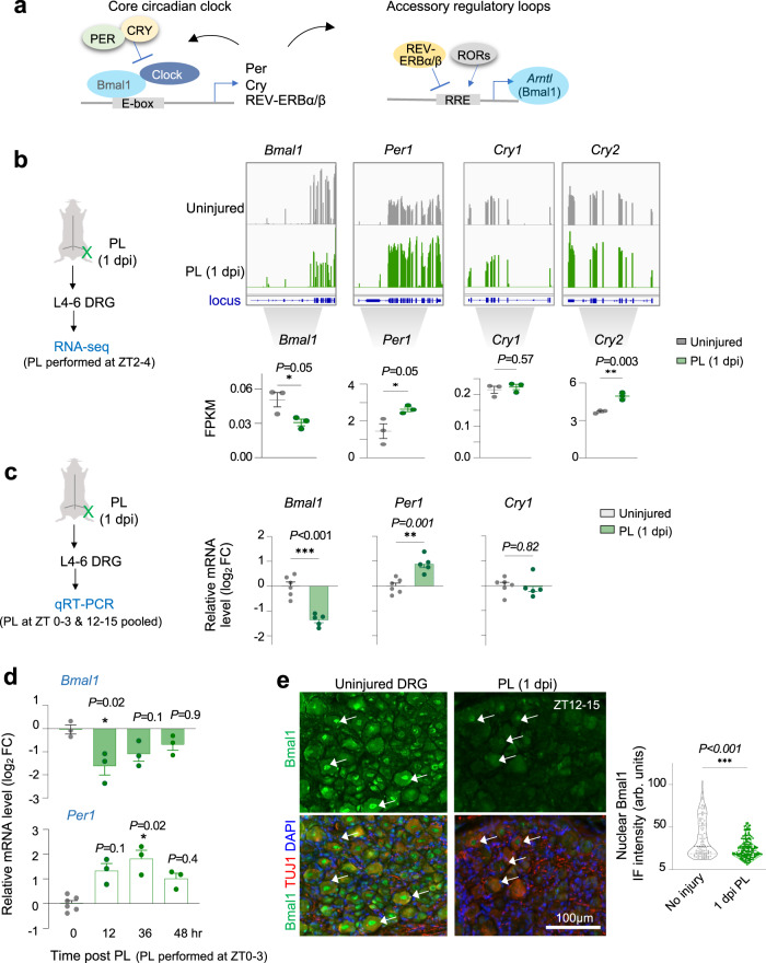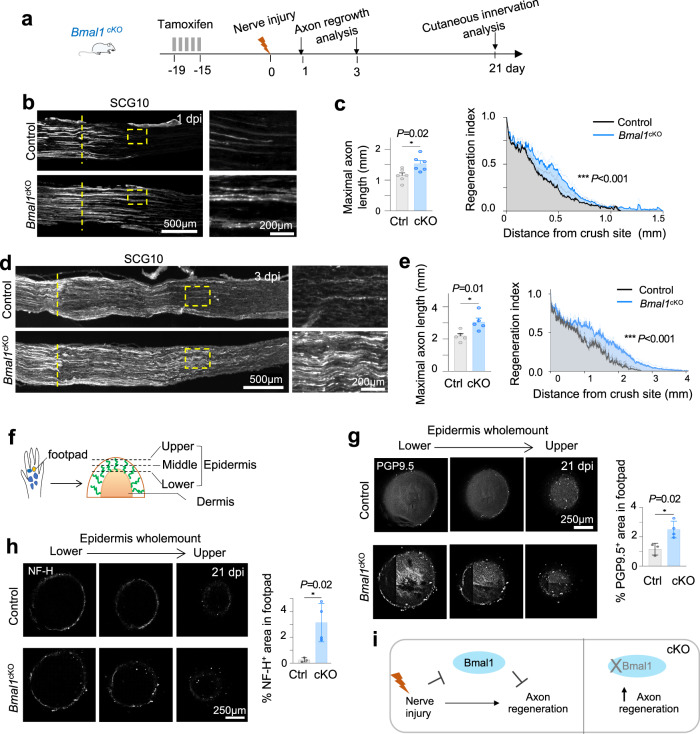 Axon regeneration of dorsal root ganglia (DRG) neurons after peripheral axotomy involves reconfiguration of gene regulatory circuits to establish regenerative gene programs. However, the underlying mechanisms remain unclear. Here, through an unbiased survey, we show that the binding motif of Bmal1, a central transcription factor of the circadian clock, is enriched in differentially hydroxymethylated regions (DhMRs) of mouse DRG after peripheral lesion. By applying conditional deletion of Bmal1 in neurons, in vitro and in vivo neurite outgrowth assays, as well as transcriptomic profiling, we demonstrate that Bmal1 inhibits axon regeneration, in part through a functional link with the epigenetic factor Tet3. Mechanistically, we reveal that Bmal1 acts as a gatekeeper of neuroepigenetic responses to axonal injury by limiting Tet3 expression and restricting 5hmC modifications. Bmal1-regulated genes not only concern axon growth, but also stress responses and energy homeostasis. Furthermore, we uncover an epigenetic rhythm of diurnal oscillation of Tet3 and 5hmC levels in DRG neurons, corresponding to time-of-day effect on axon growth potential. Collectively, our studies demonstrate that targeting Bmal1 enhances axon regeneration.