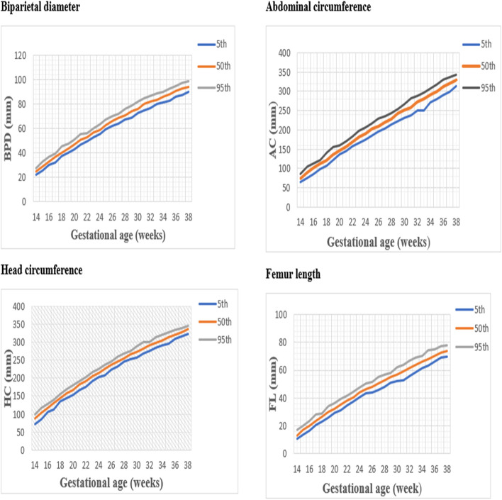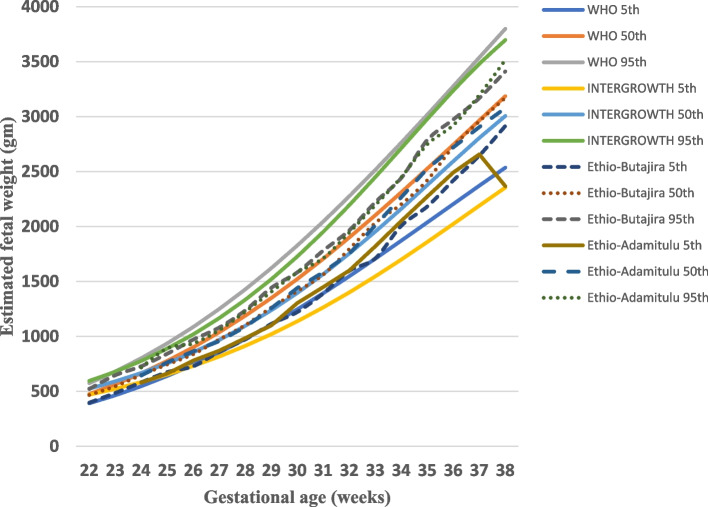 Results: We reviewed a total of 2055 ultrasound scans and 746 women who fulfill the inclusion criteria were involved". We found similar distribution patterns of biometric measurements and estimated fetal weight compared to the previous study done in Ethiopia, the WHO and INTERGROWTH-21st references. In our study, the 5th,50th and 95th percentiles of estimated fetal weight distribution have a similar pattern to the WHO and INTERGROWTH-21st charts. The 50th and 95th percentile had also a similar distribution pattern with the previous study conducted in Ethiopia. We found that 10% of the fetus were small for gestational age (below the 10th percentile) based on the Z-score of estimated fetal weight.