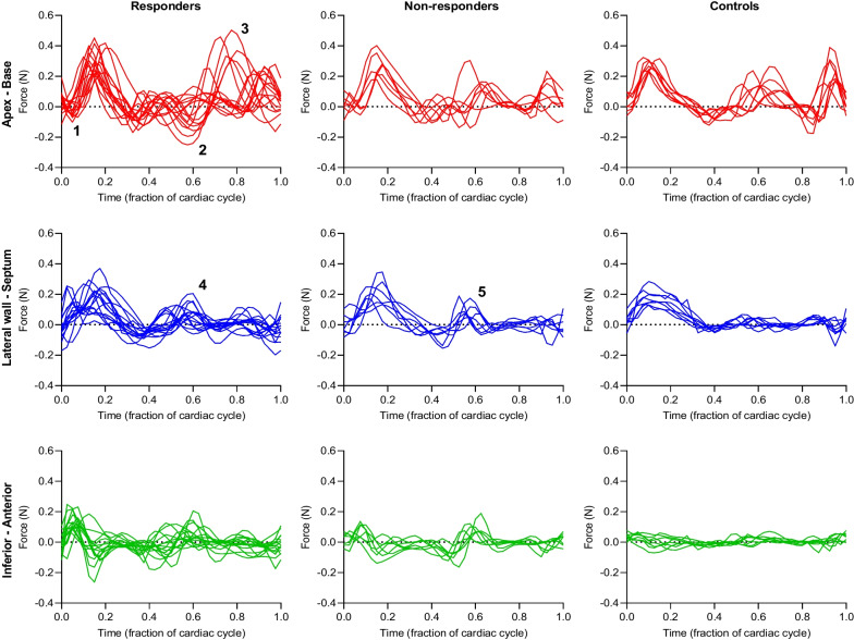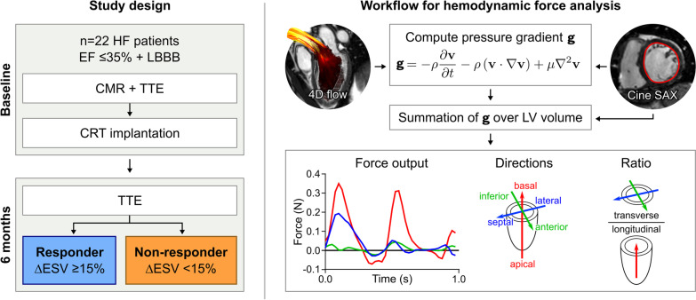 Methods: Patients with heart failure, EF < 35% and LBBB (n = 22) underwent CMR with 4D flow prior to CRT. LV HDF were computed in three directions using the Navier-Stokes equations, reported in median N [interquartile range], and the ratio of transverse/longitudinal HDF was calculated for systole and diastole. Transthoracic echocardiography was performed before and 6 months after CRT. Patients with end-systolic volume reduction ≥ 15% were defined as responders.