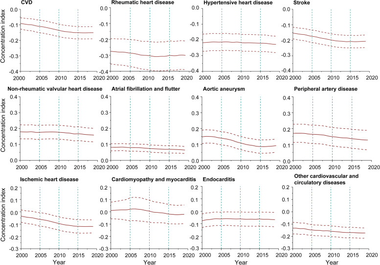 Results: The age-standardized DALY rates of CVDs decreased in 170 (91%) of 186 countries from 2000 to 2019. The concentration curves of the age-standardized DALY rates of CVDs were above the equality line from 2000 to 2019, indicating a disproportional distribution of CVD burden in low-income countries. The CIs declined from - 0.091 (95% CI: -0.128 to - 0.054) in 2000 to - 0.151 (95% CI: -0.190 to - 0.112) in 2019, indicating worsened pro-poor inequality distributions of CVD burden worldwide. A four-phase trend of changes in the CIs of age-standardized DALY rates for CVD was observed from 2000 to 2019, with an average annual percentage change (AAPC) of - 2.7% (95% CI: -3.0 to - 2.4). Decreasing trends in CIs were observed in all CVD subcategories but endocarditis, with AAPC ranging from - 6.6% (95% CI: -7.3 to - 5.9) for ischemic heart disease to - 0.2% (95% CI: -0.4 to - 0.1) for hypertensive heart disease.