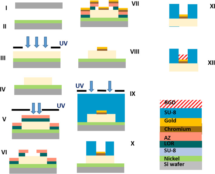 Approach: Here we describe the optimization of the fabrication process of a bio-functionalized 3D high-resolution 1mm circular subretinal implant composed of SU-8 polymer integrated with dense gold microelectrodes (23μm pitch) passivated with 3D micro-well-like structures (20μm diameter, 3μm resolution). The main challenges were overcome by step-by-step planning and optimization while utilizing a two-step bi-layer lift-off process; bio-functionalization was carried out by N2 plasma treatment and the addition of a bio-adhesion molecule.