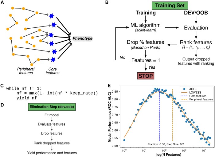 Results: To overcome these limitations, we present dRFEtools that implements dynamic recursive feature elimination (RFE), reducing computational time with high accuracy compared to standard RFE, expanding dynamic RFE to regression algorithms, and outputting the subsets of features that hold predictive power with and without peripheral features. dRFEtools integrates with scikit-learn (the popular Python machine learning platform) and thus provides new opportunities for dynamic RFE in large-scale omics data while enhancing its interpretability.