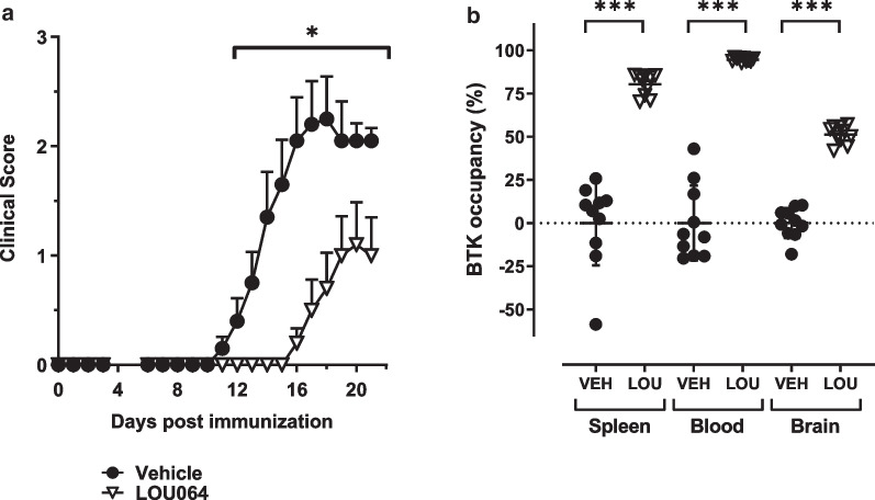 Methods: The efficacy and mechanism of action of remibrutinib was assessed in two different experimental autoimmune encephalomyelitis (EAE) mouse models for MS. The impact of remibrutinib on B cell-driven EAE pathology was determined after immunization with human myelin oligodendrocyte glycoprotein (HuMOG). The efficacy on myeloid cell and microglia driven neuroinflammation was determined in the RatMOG EAE. In addition, we assessed the relationship of efficacy to BTK occupancy in tissue, ex vivo T cell response, as well as single cell RNA-sequencing (scRNA-seq) in brain and spinal cord tissue.
