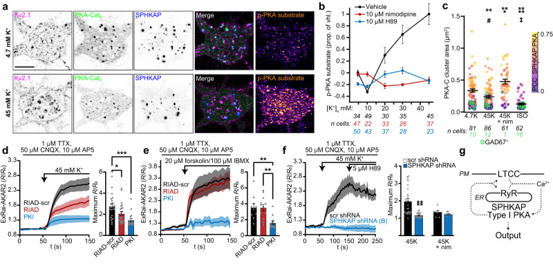 Junctions between the endoplasmic reticulum (ER) and the plasma membrane (PM) are specialized membrane contacts ubiquitous in eukaryotic cells. Concentration of intracellular signaling machinery near ER-PM junctions allows these domains to serve critical roles in lipid and Ca2+ signaling and homeostasis. Subcellular compartmentalization of protein kinase A (PKA) signaling also regulates essential cellular functions, however, no specific association between PKA and ER-PM junctional domains is known. Here, we show that in brain neurons type I PKA is directed to Kv2.1 channel-dependent ER-PM junctional domains via SPHKAP, a type I PKA-specific anchoring protein. SPHKAP association with type I PKA regulatory subunit RI and ER-resident VAP proteins results in the concentration of type I PKA between stacked ER cisternae associated with ER-PM junctions. This ER-associated PKA signalosome enables reciprocal regulation between PKA and Ca2+ signaling machinery to support Ca2+ influx and excitation-transcription coupling. These data reveal that neuronal ER-PM junctions support a receptor-independent form of PKA signaling driven by membrane depolarization and intracellular Ca2+, allowing conversion of information encoded in electrical signals into biochemical changes universally recognized throughout the cell.