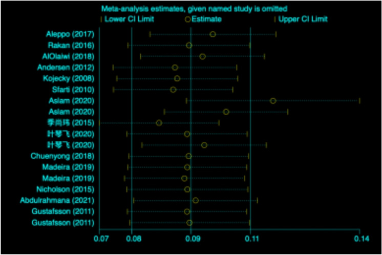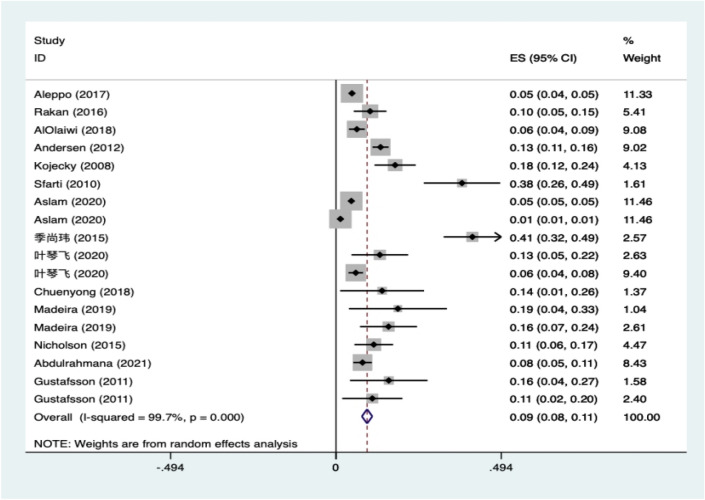 Although there was no significant heterogeneity in the meta-publication, sensitivity analyses revealed significant heterogeneity. Overall, the prevalence was higher in women (N = 6, R = 4.6%, 95% CI 3.1%, 6.0%, and I2 = 99.8%) than in men (N = 6, R = 3.4%, 95% CI 2.0%, 4.7%, and I2 = 99.6the %); prevalence of type 2 diabetes (N = 9, R = 12.5%, 95% CI 7.7%, 17.3%, and I2 = 95.4%) was higher than type 1 diabetes (N = 7, R = 8.3%, 95% CI 6.4%, 10.2%, and I2 = 93.6%); the prevalence of DGP was slightly lower in DM patients aged over 60 years (N = 6, R = 5.5%, 95% CI 3.3%, 7.7%, and I2 = 99.9%) compared to patients under 60 years of age (N = 12, R = 15.8%, 95% CI 11 15.8%, 95% CI 11.4%, 20.2%, and I2 = 88.3%). In conclusion, our findings indicate that the combined estimated prevalence of gastroparesis in diabetic patients is 9.3%. However, the sensitivity of the results is high, the robustness is low, and there are significant bias factors. The subgroup analysis revealed that the prevalence of DM-DGP is associated with factors such as gender, diabetes staging, age, and study method.