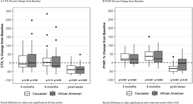 During lactation, changes in maternal calcium metabolism are necessary to provide adequate calcium for newborn skeletal development. The calcium in milk is derived from the maternal skeleton through a process thought to be mediated by the actions of parathyroid hormone-related protein (PTHrP) in combination with decreased circulating estrogen concentrations. After weaning, bone lost during lactation is rapidly regained. Most studies of bone metabolism in lactating women have been performed in Caucasian subjects. There are well-documented differences between African American (AA) and Caucasian (C) bone metabolism, including higher bone mineral density (BMD), lower risk of fracture, lower 25-hydroxyvitamin D (25(OH) D), and higher PTH in AA compared to C. In this prospective paired cohort study, BMD and markers of bone turnover were compared in self-identified AA and C mothers during lactation and after weaning. BMD decreased in both AA and C women during lactation, with similar decreases at the lumbar spine (LS) and greater bone loss in the C group at the femoral neck (FN) and total hip (TH), demonstrating that AA are not resistant to PTHrP during lactation. BMD recovery compared to the 2 week postpartum baseline was observed 6 months after weaning, though the C group did not have complete recovery at the FN. Increases in markers of bone formation and resorption during lactation were similar in AA and C. C-terminal telopeptide (CTX) decreased to 30% below post-pregnancy baseline in both groups 6 months after weaning, while procollagen type 1 N-terminal (P1NP) returned to baseline in the AA group and fell to below baseline in the C group. Further investigation is required to determine impacts on long term bone health for women who do not fully recover BMD before a subsequent pregnancy.