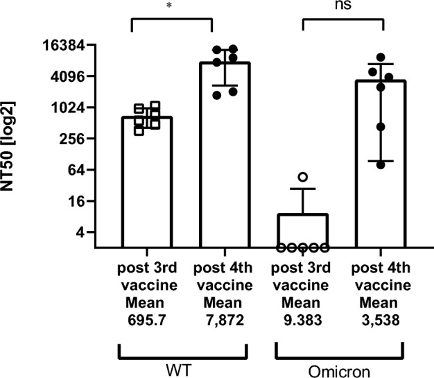 The humoral response after the fourth dose of a mRNA vaccine against COVID-19 has not been adequately described in elderly recipients, particularly those not exposed previously to SARS-CoV-2. Serum anti-RBD IgG levels (Abbott SARS-CoV-2 IgG II Quant assay) and neutralizing capacities (spike SARS-CoV-2 pseudovirus Wuhan and Omicron BA.1 variant) were measured after the third and fourth doses of a COVID-19 mRNA vaccine among 46 elderly residents (median age 85 years [IQR 81; 89]) of an assisted living facility. Among participants never infected by SARS-CoV-2, the mean serum IgG levels against RBD (2025 BAU/ml), 99 days after the fourth vaccine, was as high as 76 days after the third vaccine (1987 BAU/ml), and significantly higher (p = 0.030) when the latter were corrected for elapsed time. Neutralizing antibody levels against the historical Wuhan strain were significantly higher (Mean 1046 vs 1573; p = 0.002) and broader (against Omicron) (Mean 170 vs 375; p = 0.018), following the fourth vaccine. The six individuals with an Omicron breakthrough infection mounted strong immune responses for anti-RBD and neutralizing antibodies against the Omicron variant indicating that the fourth vaccine dose did not prevent a specific adaptation of the immune response. These findings point out the value of continued vaccine boosting in the elderly population.