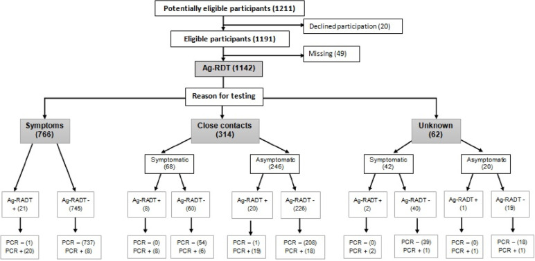 Methods: This prospective diagnostic study was conducted at PHCs in Mallorca, Spain. Patients were ≤ 18 years-old that attended sites for RT-PCR testing due to symptoms suggestive of infection (fever, headache, nasal congestion and dry cough, among others) or epidemiological exposure (close contacts). Two samples were collected: a nasal mid-turbinate sample for Ag-RDTs and a nasopharyngeal swab for RT-PCR testing. The sensitivity, specificity, and predictive values of the AgRDT were calculated using the RT-PCR results as the reference.