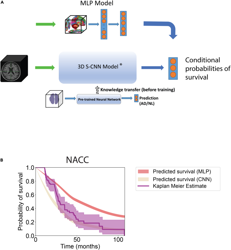 Quantifying the risk of progression to Alzheimer's disease (AD) could help identify persons who could benefit from early interventions. We used data from the Alzheimer's Disease Neuroimaging Initiative (ADNI, n = 544, discovery cohort) and the National Alzheimer's Coordinating Center (NACC, n = 508, validation cohort), subdividing individuals with mild cognitive impairment (MCI) into risk groups based on cerebrospinal fluid amyloid-β levels and identifying differential gray matter patterns. We then created models that fused neural networks with survival analysis, trained using non-parcellated T1-weighted brain MRIs from ADNI data, to predict the trajectories of MCI to AD conversion within the NACC cohort (integrated Brier score: 0.192 [discovery], and 0.108 [validation]). Using modern interpretability techniques, we verified that regions important for model prediction are classically associated with AD. We confirmed AD diagnosis labels using postmortem data. We conclude that our framework provides a strategy for risk-based stratification of individuals with MCI and for identifying regions key for disease prognosis.