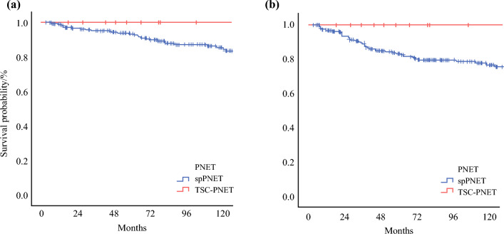 Results: Of the 347 patients resected for PNETs, 14 were TSC-PNETs and 241 were non-functional spPNETs. The median age for the whole cohort was 56 years (interquartile range [IQR] 21.0) and 47% were female. The median follow-up was 103.8 months (95% confidence interval [CI] 89.2-118.6). Specifically, 14 patients with TSC-PNETs and 194 patients with spPNETs were included. Compared with spPNETs, patients with TSC-PNETs were operated on at a younger age (24.0 vs. 57.5 years; p < 0.001), were more frequently multifocal (28.5% vs. 0.0%; p < 0.001), were more likely to undergo minimally invasive operations (78.6% vs. 24.3%; p < 0.001), and had more R1 resections (28.6% vs. 5.7%; p = 0.006). Local and distant tumor recurrence was only observed in the spPNET group. The 5-year mortality rates for the spPNET and TSC-PNET groups were 6.2% and 0.0%, respectively. No PNET-related deaths were observed among TSC-PNETs.
