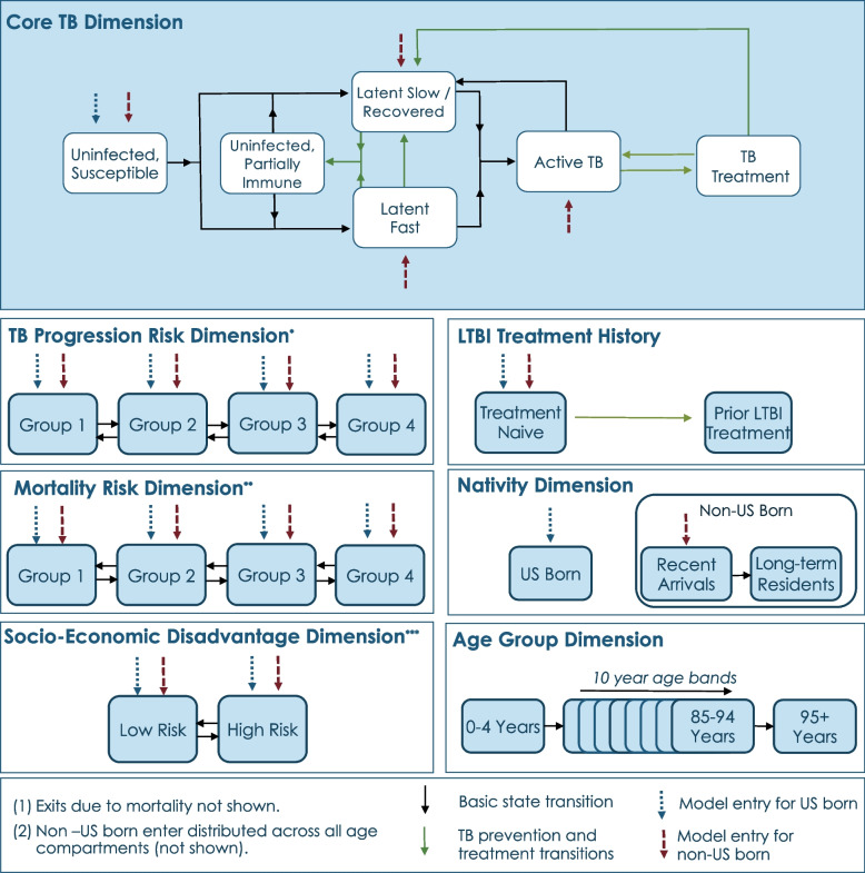 Background: In the United States, the tuberculosis (TB) disease burden and associated factors vary substantially across states. While public health agencies must choose how to deploy resources to combat TB and latent tuberculosis infection (LTBI), state-level modeling analyses to inform policy decisions have not been widely available.