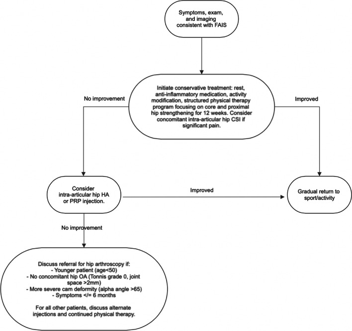 Recent findings: Supervised physical therapy programs that focus on active strengthening and core strengthening are more effective than unsupervised, passive, and non-core-focused programs. There is promising evidence for the use of intra-articular hyaluronic acid and PRP as adjunct treatment options. Recent systematic reviews and meta-analyses have found that in young active patients, hip arthroscopy demonstrates improved short-term outcomes over physical therapy. The decision for the management of FAIS is complex and should be specific to each patient. Consideration of the patient's age, timing to return to sport, longevity of treatment, hip morphology, and degree of cartilage degeneration is required to make an informed decision in the treatment of these patients.