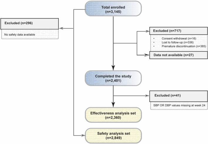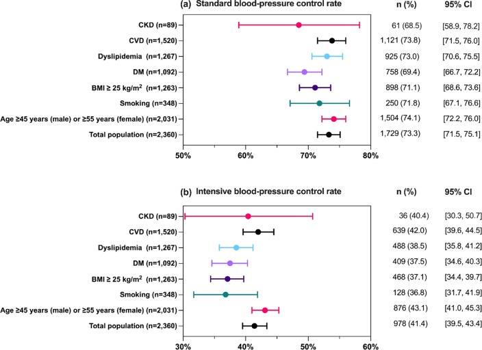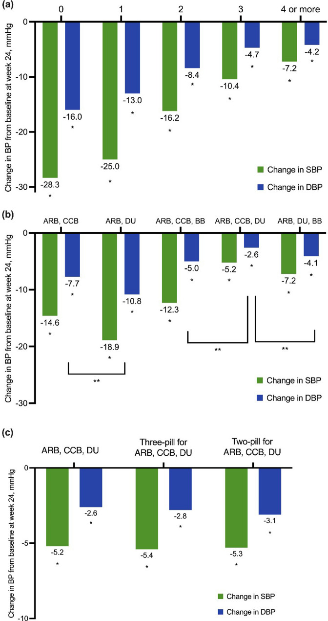 Methods: This prospective, multicenter observational study assessed the real-world safety and effectiveness of an SPC containing olmesartan, amlodipine, and hydrochlorothiazide (O/A/H) in South Korean patients with hypertension and cardiovascular risk factors. BP control rates, defined as the percentage of patients achieving systolic BP (SBP) < 130 mmHg and diastolic BP (DBP) < 80 mmHg for intensive BP control, and < 140 mmHg and < 90 mmHg, respectively, for standard BP control, were investigated across various cardiovascular risk groups, along with changes in SBP and DBP from baseline to week 24.