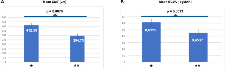 Results: Eight eyes from seven patients were analyzed in this study. At baseline, mean BCVA (LogMAR) ± standard error (SE) and mean CST (central subfield thickness)(µm) ± SE were 0.6125 ± 0.14 and 412.50 ± 24.65, respectively. After a mean follow-up time of 12.92 ± 1.34 months, mean CST (µm) ± SE and BCVA (LogMAR) ± SE were 294.75 ± 19.68 (p = 0.0078) and 0.4537 ± 0.12 (p = 0.0313), respectively. A statistically significant reduction in mean CST and an improvement in mean BCVA were noted after SRD resolution with laser therapy application. The mean serous retinal detachment resolution time (months) ± SE was 3.75 ± 1.08. No adverse events were registered, including enlargement of atrophic alterations and choroidal neovascularization.