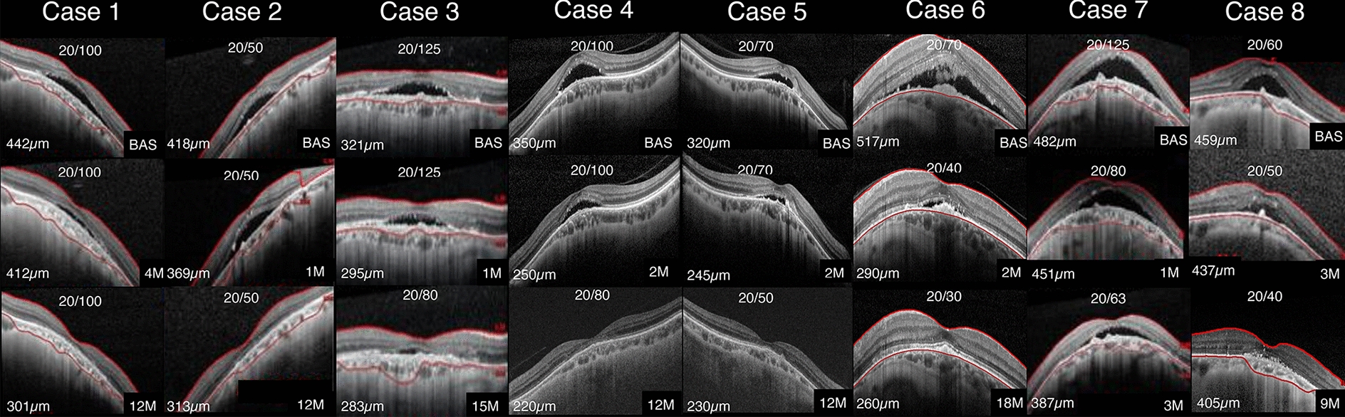 Methods: This retrospective study included seven consecutive patients (eight eyes) with SRD secondary to dome-shaped macula who underwent a comprehensive ophthalmological evaluation including logMAR BCVA, slit-lamp biomicroscopy, indirect ophthalmoscopy, and spectral-domain optical coherence tomography (SD-OCT) (Spectralis; Heidelberg Engineering, Germany) before combined Pascal® SP laser plus EpM-SDL with 1 to 6 month intervals, postoperatively, with a mean ± standard error (SE) follow-up time of 12.92 ± 1.34 months.