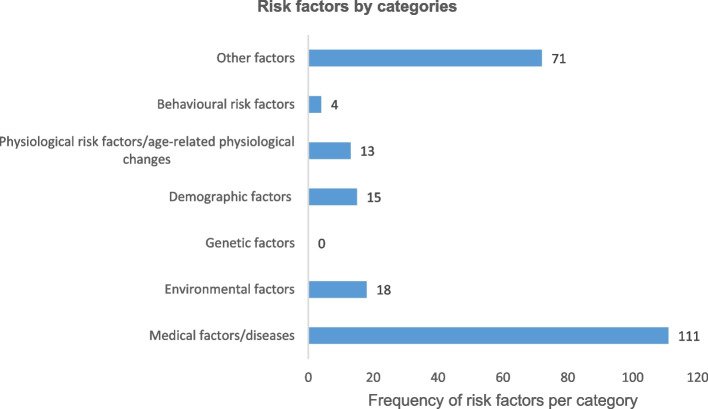 Results: Forty-seven articles that met the inclusion criteria identified 98 risk factors across six categories. Behavioural risk factors, reported by only two studies, were the least investigated of all the categories, whereas medical factors/diseases were the most investigated. No genetic factors were documented. The top five risk factors were increasing age/advanced age (n = 12), Benign Prostatic Hyperplasia (n = 11), Diabetes Mellitus (n = 11), Detrusor overactivity (n = 10), limitation in physical function/ADL disability (n = 10), increased Body Mass Index (BMI)/overweight/obesity (n = 8), Dementia (n = 8), and Parkinson's disease (n = 7).