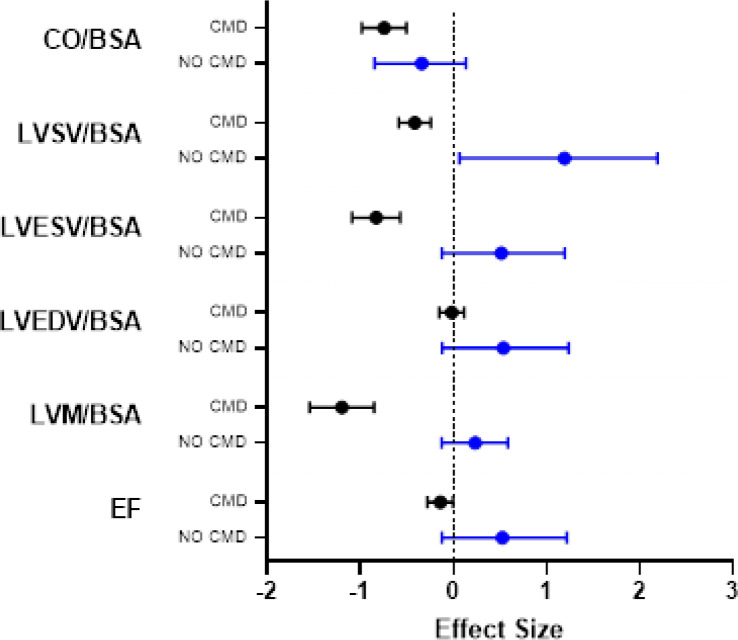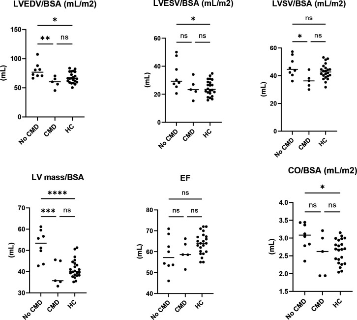 Conclusions: Among women with SLE with chest pain and no obstructive CAD, 40% have CMD. While evaluations of known inflammatory markers (such as CRP and ESR) predictably correlated with decreased cardiac function, our study found that decreased fasting insulin levels as a novel marker of diminished LV function. In addition, low insulin levels were observed to correlate with increased LVMi and ECV, suggesting a cardioprotective effect of insulin in SLE patients. We also noted that SLICC DI, an assessment of SLE damage, correlates with cardiac dysfunction in SLE. Our findings underline the potential of non-invasive cMRI as a tool for monitoring cardiovascular function in SLE, particularly in patients with high SLICC DI, ESR and CRP and low fasting insulin levels.