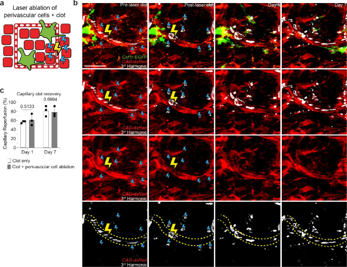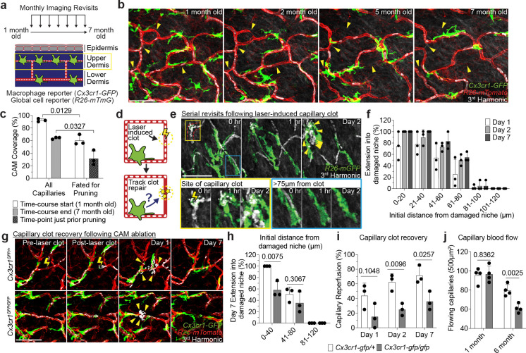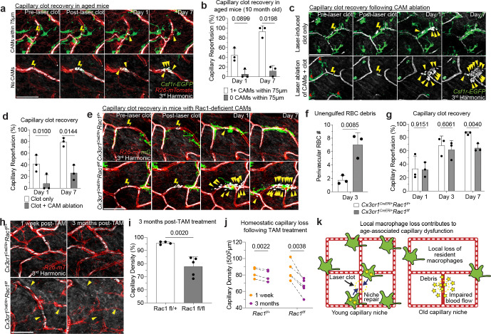 All mammalian organs depend upon resident macrophage populations to coordinate repair processes and facilitate tissue-specific functions1-3. Recent work has established that functionally distinct macrophage populations reside in discrete tissue niches and are replenished through some combination of local proliferation and monocyte recruitment4,5. Moreover, decline in macrophage abundance and function in tissues has been shown to contribute to many age-associated pathologies, such as atherosclerosis, cancer, and neurodegeneration6-8. Despite these advances, the cellular mechanisms that coordinate macrophage organization and replenishment within an aging tissue niche remain largely unknown. Here we show that capillary-associated macrophages (CAMs) are selectively lost over time, which contributes to impaired vascular repair and tissue perfusion in older mice. To investigate resident macrophage behavior in vivo, we have employed intravital two-photon microscopy to non-invasively image in live mice the skin capillary plexus, a spatially well-defined model of niche aging that undergoes rarefication and functional decline with age. We find that CAMs are lost with age at a rate that outpaces that of capillary loss, leading to the progressive accumulation of capillary niches without an associated macrophage in both mice and humans. Phagocytic activity of CAMs was locally required to repair obstructed capillary blood flow, leaving macrophage-less niches selectively vulnerable to both homeostatic and injury-induced loss in blood flow. Our work demonstrates that homeostatic renewal of resident macrophages is not as finely tuned as has been previously suggested9-11. Specifically, we found that neighboring macrophages do not proliferate or reorganize sufficiently to maintain an optimal population across the skin capillary niche in the absence of additional cues from acute tissue damage or increased abundance of growth factors, such as colony stimulating factor 1 (CSF1). Such limitations in homeostatic renewal and organization of various niche-resident cell types are potentially early contributors to tissue aging, which may provide novel opportunities for future therapeutic interventions.