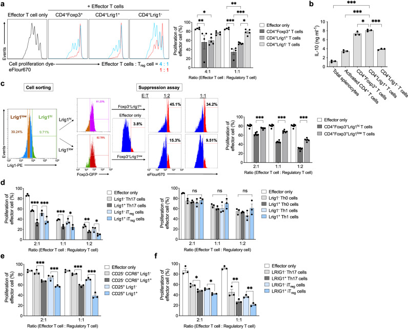 Regulatory T cells (Treg) are CD4+ T cells with immune-suppressive function, which is defined by Foxp3 expression. However, the molecular determinants defining the suppressive population of T cells have yet to be discovered. Here we report that the cell surface protein Lrig1 is enriched in suppressive T cells and controls their suppressive behaviors. Within CD4+ T cells, Treg cells express the highest levels of Lrig1, and the expression level is further increasing with activation. The Lrig1+ subpopulation from T helper (Th) 17 cells showed higher suppressive activity than the Lrig1- subpopulation. Lrig1-deficiency impairs the suppressive function of Treg cells, while Lrig1-deficient naïve T cells normally differentiate into other T cell subsets. Adoptive transfer of CD4+Lrig1+ T cells alleviates autoimmune symptoms in colitis and lupus nephritis mouse models. A monoclonal anti-Lrig1 antibody significantly improves the symptoms of experimental autoimmune encephalomyelitis. In conclusion, Lrig1 is an important regulator of suppressive T cell function and an exploitable target for treating autoimmune conditions.