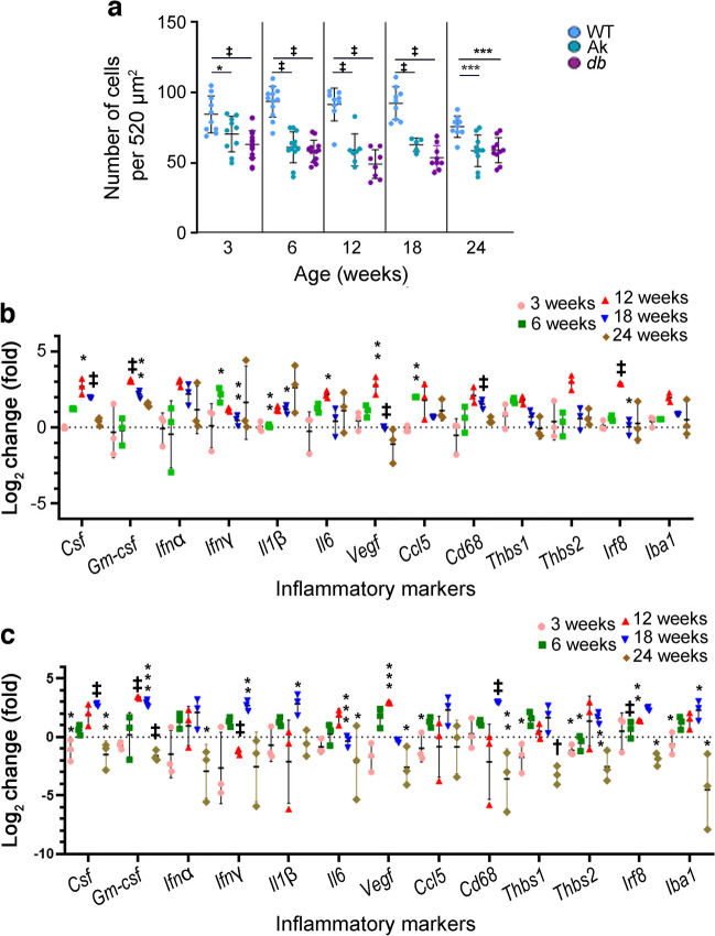 Methods: Loss of pericytes and levels of inflammatory markers at the mRNA and protein levels were investigated in two genetic models of diabetes, Ins2Akita/+ (a model of type 1 diabetes) and Leprdb/db (a model of type 2 diabetes), at early stages of diabetic retinopathy. In addition, changes that accompany gliosis and the retinal vasculature were determined. Finally, changes in retinal pericytes chronically incubated with vehicle or increasing amounts of IFNγ were investigated to determine the effects on pericyte survival. The numbers of pericytes, microglia, astrocytes and endothelial cells in retinal flatmounts were determined by immunofluorescence. Protein and mRNA levels of inflammatory factors were determined using multiplex ELISAs and quantitative reverse transcription PCR (qRT-PCR). The effects of IFNγ on the murine retinal pericyte survival-related platelet-derived growth factor receptor β (PDGFRβ) signalling pathway were investigated by western blot analysis. Finally, the levels of cell death-associated protein kinase C isoform delta (PKCδ) and cleaved caspase 3 (CC3) in pericytes were determined by western blot analysis and immunocytochemistry.