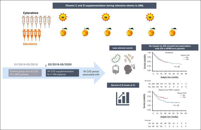 Recent studies have highlighted the role of vitamin C and D in acute myeloid leukemia (AML). In 2018, we changed our practices to add both vitamins to the supportive care for all consecutive patients with AML undergoing intensive chemotherapy. In this study, we compared the outcomes of patients treated before and after this change in practice. From 2015 to 2020, 431 patients were included, 262 of whom received no supplementation and 169 of whom received vitamin supplementation. Vitamin C and vitamin D was administered from day 10 of chemotherapy until hematologic recovery from induction and consolidation. Most patients presented at diagnosis with low levels of vitamin C and D. Upon recovery from induction, vitamin D levels among the vitamin C/D group significantly increased compared with those at diagnosis, and pretransplant levels were significantly higher in the vitamin C/D group compared with the control group (median of 33 vs 19 ng/mL; P < .0001). During induction, the rates of bacterial or fungal infection, hemorrhage, or macrophage activation syndrome were lower in the vitamin C/D group, whereas there was no difference in response rate, relapse incidence, and overall survival (OS). However, the multivariate analysis for OS showed a significant interaction between vitamin C/D and NPM1 mutation, meaning that vitamin C/D supplementation was significantly and independently associated with better OS in patients with NPM1 mutations (hazard ratio [HR], 0.52; 95% confidence interval [CI], 0.30-0.90; P = .019) compared with patients with wild-type NPM1 (HR, 1.01; 95% CI, 0.68-1.51; P = .95). In conclusion, vitamin C/D supplementation is safe and could influence the outcomes of patients with AML undergoing intensive chemotherapy.
