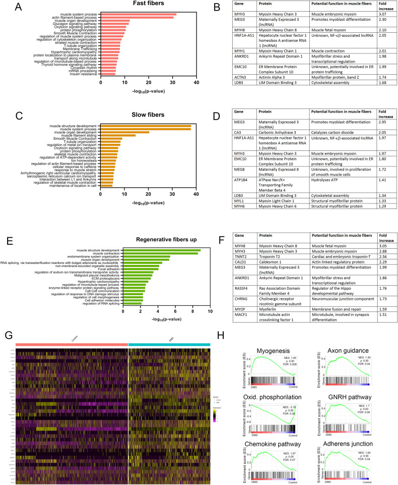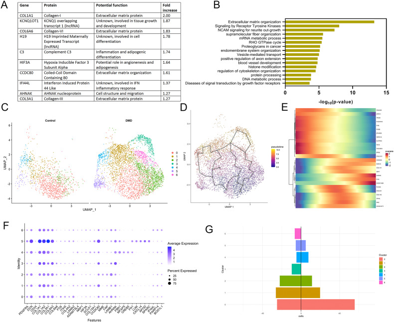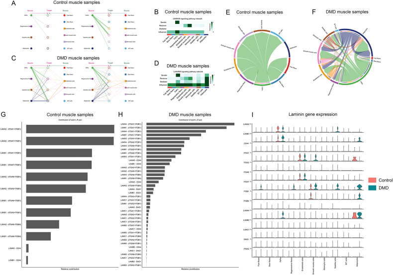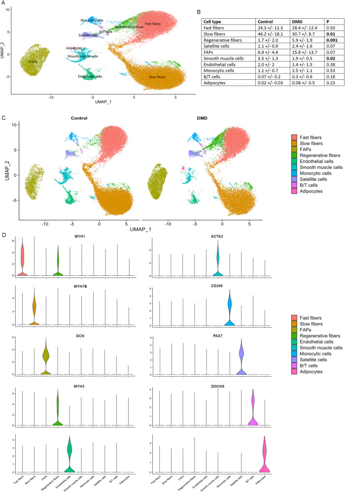 Duchenne muscular dystrophy is a genetic disease produced by mutations in the dystrophin gene characterized by early onset muscle weakness leading to severe and irreversible disability. The cellular and molecular consequences of the lack of dystrophin in humans are only partially known, which is crucial for the development of new therapies aiming to slow or stop the progression of the disease. Here we have analyzed quadriceps muscle biopsies of seven DMD patients aged 2 to 4 years old and five age and gender matched controls using single nuclei RNA sequencing (snRNAseq) and correlated the results obtained with clinical data. SnRNAseq identified significant differences in the proportion of cell population present in the muscle samples, including an increase in the number of regenerative fibers, satellite cells, and fibro-adipogenic progenitor cells (FAPs) and a decrease in the number of slow fibers and smooth muscle cells. Muscle samples from the younger patients with stable mild weakness were characterized by an increase in regenerative fibers, while older patients with moderate and progressive weakness were characterized by loss of muscle fibers and an increase in FAPs. An analysis of the gene expression profile in muscle fibers identified a strong regenerative signature in DMD samples characterized by the upregulation of genes involved in myogenesis and muscle hypertrophy. In the case of FAPs, we observed upregulation of genes involved in the extracellular matrix regeneration but also several signaling pathways. Indeed, further analysis of the potential intercellular communication profile showed a dysregulation of the communication profile in DMD samples identifying FAPs as a key regulator of cell signaling in DMD muscle samples. In conclusion, our study has identified significant differences at the cellular and molecular levels in the different cell populations present in skeletal muscle samples of patients with DMD compared to controls.