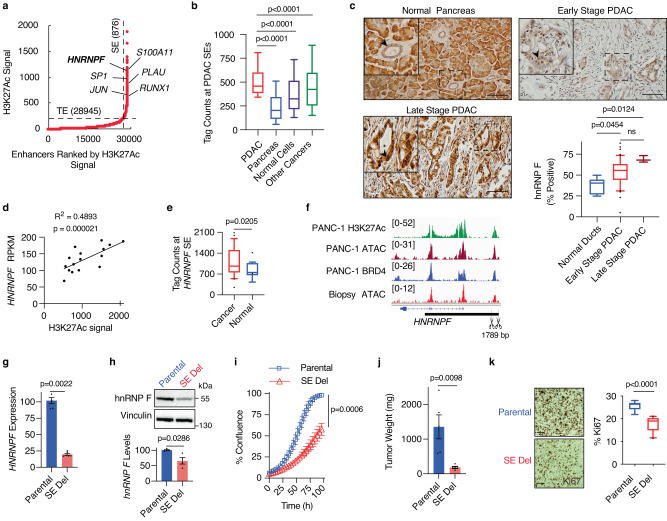 Pancreatic ductal adenocarcinoma (PDAC) is a lethal malignancy in need of new therapeutic options. Using unbiased analyses of super-enhancers (SEs) as sentinels of core genes involved in cell-specific function, here we uncover a druggable SE-mediated RNA-binding protein (RBP) cascade that supports PDAC growth through enhanced mRNA translation. This cascade is driven by a SE associated with the RBP heterogeneous nuclear ribonucleoprotein F, which stabilizes protein arginine methyltransferase 1 (PRMT1) to, in turn, control the translational mediator ubiquitin-associated protein 2-like. All three of these genes and the regulatory SE are essential for PDAC growth and coordinately regulated by the Myc oncogene. In line with this, modulation of the RBP network by PRMT1 inhibition reveals a unique vulnerability in Myc-high PDAC patient organoids and markedly reduces tumor growth in male mice. Our study highlights a functional link between epigenetic regulation and mRNA translation and identifies components that comprise unexpected therapeutic targets for PDAC.