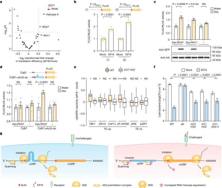 Translational reprogramming allows organisms to adapt to changing conditions. Upstream start codons (uAUGs), which are prevalently present in mRNAs, have crucial roles in regulating translation by providing alternative translation start sites1-4. However, what determines this selective initiation of translation between conditions remains unclear. Here, by integrating transcriptome-wide translational and structural analyses during pattern-triggered immunity in Arabidopsis, we found that transcripts with immune-induced translation are enriched with upstream open reading frames (uORFs). Without infection, these uORFs are selectively translated owing to hairpins immediately downstream of uAUGs, presumably by slowing and engaging the scanning preinitiation complex. Modelling using deep learning provides unbiased support for these recognizable double-stranded RNA structures downstream of uAUGs (which we term uAUG-ds) being responsible for the selective translation of uAUGs, and allows the prediction and rational design of translating uAUG-ds. We found that uAUG-ds-mediated regulation can be generalized to human cells. Moreover, uAUG-ds-mediated start-codon selection is dynamically regulated. After immune challenge in plants, induced RNA helicases that are homologous to Ded1p in yeast and DDX3X in humans resolve these structures, allowing ribosomes to bypass uAUGs to translate downstream defence proteins. This study shows that mRNA structures dynamically regulate start-codon selection. The prevalence of this RNA structural feature and the conservation of RNA helicases across kingdoms suggest that mRNA structural remodelling is a general feature of translational reprogramming.
