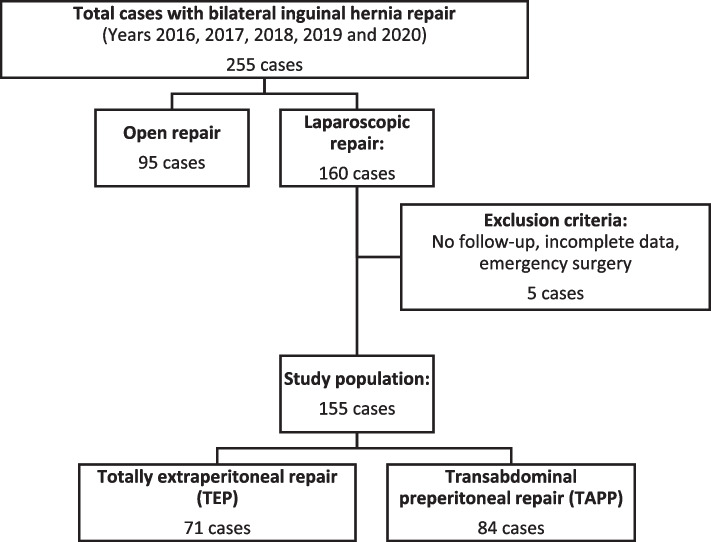 Methods: We conducted a retrospective cohort study of patients operated on for bilateral inguinal hernia by TEP and TAPP repair from 2016 to 2020. Intraoperative complications, operative time, acute postoperative pain, hospital stay, postoperative complications, chronic inguinal pain, and recurrence were compared.