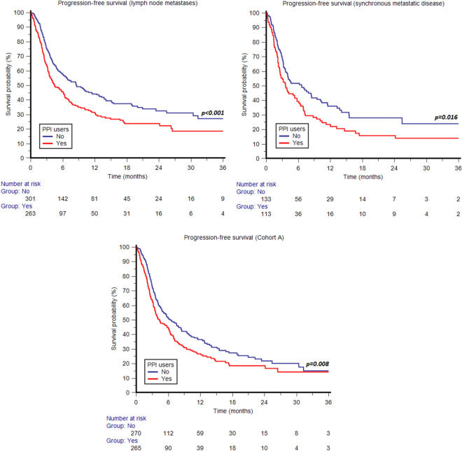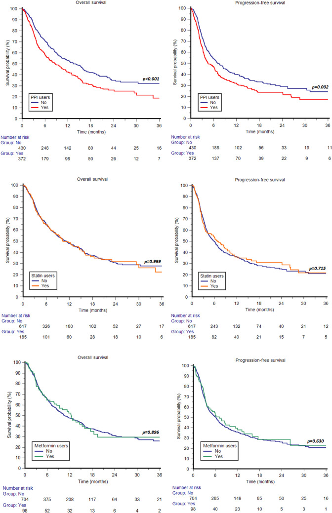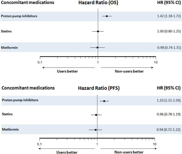 Results: A total of 802 patients were eligible for this retrospective study; the median follow-up time was 15.3 months. PPI users compared to non-users showed inferior PFS (4.5 vs. 7.2 months, p = 0.002) and OS (8.7 vs. 14.1 months, p < 0.001). Concomitant PPI use remained a significant predictor of PFS and OS after multivariate Cox analysis. The use of statins or metformin was not associated with response or survival.