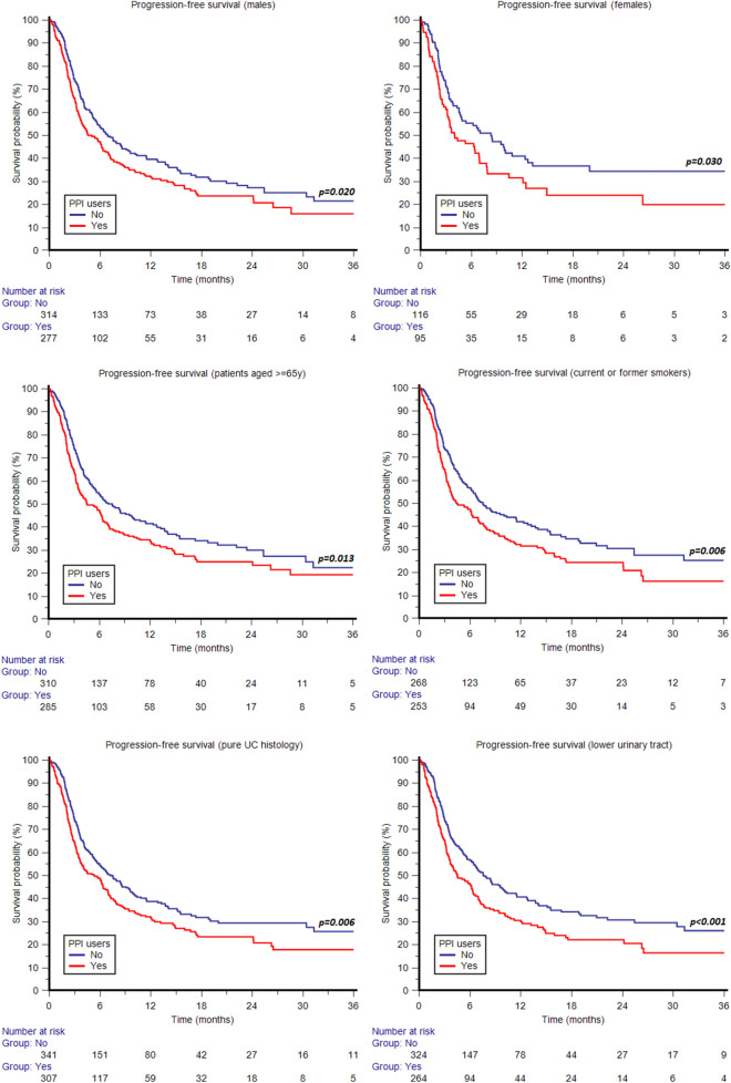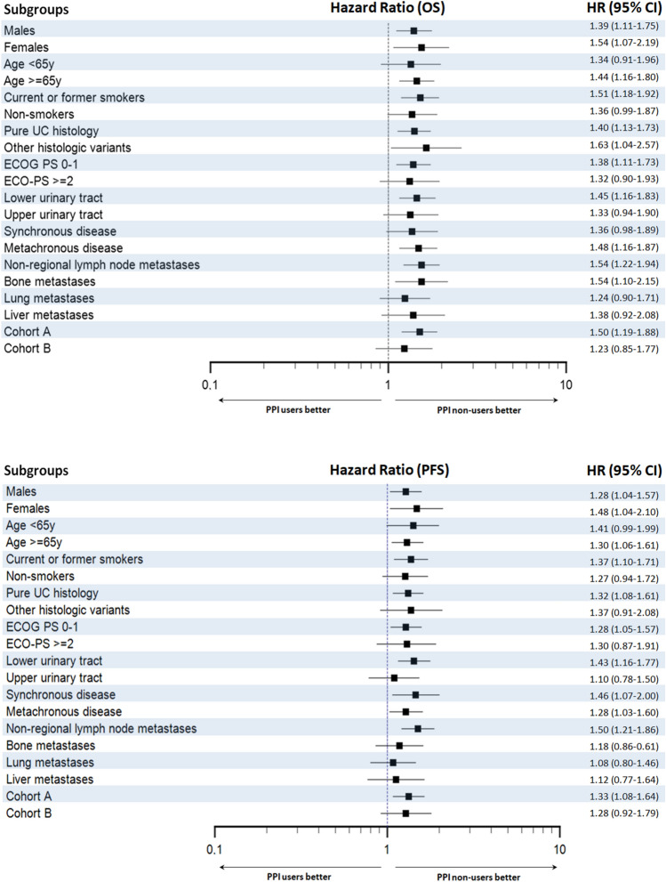 Conclusions: Our study results suggest a significant prognostic impact of concomitant PPI use in mUC patients receiving pembrolizumab in the real-world context. The mechanism of this interaction warrants further elucidation.