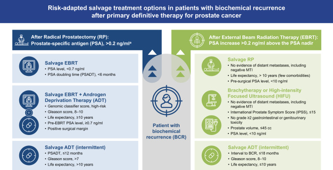 Results: European and US guidelines support the risk-stratified management of BCR. Post-RP, salvage EBRT (with or without androgen deprivation therapy [ADT]) is an accepted treatment option for patients with BCR. Post-EBRT, local salvage therapies (RP, cryotherapy, high-intensity focused ultrasound, stereotactic body radiotherapy, and low-dose-rate and high-dose-rate brachytherapy) have demonstrated comparable relapse-free survival rates but differing adverse event profiles, short and long term. Local salvage therapies should be used for local-only relapses while ADT should be considered for regional or distant relapses. In practice, patients often receive ADT, with varying guidance for intermittent ADT vs. continuous ADT, due to consideration of quality-of-life effects.