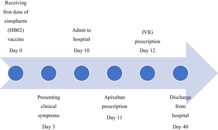 Case presentation: An 18-year-old male Caucasian patient with complaints of severe abdominal, low back, and lower extremity pain presented to the medical center. He received the first dose of the Sinopharm (HB02) vaccine against coronavirus disease 2019 10 days before hospital attendance. In the laboratory examination, decreased platelet count and increased D-dimer were observed. During hospital admission, the diagnosis of pulmonary embolism was reached. He received vaccine-induced thrombotic thrombocytopenia therapy consisting of intravenous immune globulin and direct oral anticoagulant. Platelet count increased and he was discharged after 1 month.