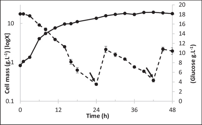 R-(+)-Perillic acid, a promising anticancer and immunomodulatory agent, is the major product from the biotransformation of R-(+)-limonene-rich orange essential oil by the yeast Yarrowia lipolytica. Due to the abundance and low cost of orange essential oil, which is a byproduct of the citrus industry, we attempted to improve the biotransformation process by optimizing yeast cell mass production. Then, the whole process was transposed and adapted to a 2-L instrumented bioreactor. Cell mass production was optimized in shaker flasks using a statistical experimental design. The optimized medium (g·L-1: 22.9 glucose, 7.7 peptone, 4.1 yeast extract and 1.0 malt extract) resulted in a 13.0 g·L-1 final cell concentration and 0.18 g cell·L-1·h-1 productivity. A further increase to 18.0 g·L-1 was achieved in a 2-L bioreactor upon fed-batch culture. High-purity limonene bioconversion was performed in the same bioreactor utilizing top aeration to diminish terpene volatilization; as a result, 839.6 mg·L-1 perillic acid accumulated after 48 h. Under the same conditions, industrial orange essential oil afforded 806.4 mg·L-1 perillic acid. The yeast growth medium optimization resulted in a twofold increase in biomass accumulation and a reduction in growth medium nitrogen sources, which lowered the catalytic biomass production cost. Compared with conventional bottom aeration, the bioreactor top aeration strategy resulted in higher bioconversion rates. The conditions developed for high-purity limonene bioconversion were successfully applied to low-cost orange essential oil, showing the robustness of Y. lipolytica yeast.