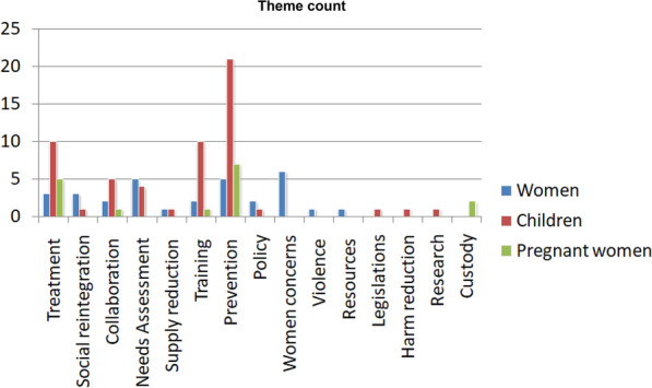 Results: Twenty published documents from nine countries were reviewed. The common themes that emerged for women, pregnancy, and children were needs assessment, prevention, treatment, training, supply reduction, and collaboration and coordination. Custody of children was a unique theme for pregnant women. Specific psycho-social concerns and social reintegration were special themes for women, whereas legislation, harm reduction, research, and resource allocation were children-specific additional themes. For women-specific content analysis, special issues/concerns in women with drug misuse, need assessment, and prevention were the three most frequent themes; for the children-specific policies, prevention, training, and treatment comprised the three most occurring themes. For pregnant women/pregnancy, prevention, treatment, and child custody were the highest occurring themes. According to ratings of the countries' policies, there is limited adherence to international guidelines which ensure activities are in sync with the specific needs of women, pregnant women and their children.
