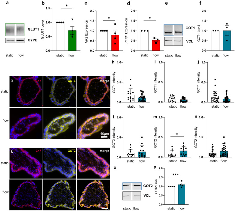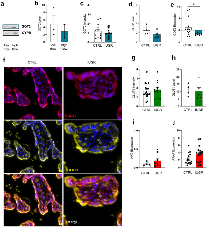 Results: Based on a trophoblast cell line cultured in a fluidic flow system, changes caused by shear stress were analyzed and compared to static conditions. RNA sequencing and bioinformatics analysis revealed an altered transcriptome and enriched gene ontology terms associated with amino acid and mitochondrial metabolism. A decreased GLUT1 expression and reduced glucose uptake, together with downregulated expression of key glycolytic rate-limiting enzymes, hexokinase 2 and phosphofructokinase 1 was observed. Altered mitochondrial ATP levels and mass spectrometry data, suggested a shift in energy production from glycolysis towards mitochondrial oxidative phosphorylation. This shift in energy production could be supported by increased expression of glutamic-oxaloacetic transaminase variants in response to shear stress as well as under low glucose availability or after silencing of GLUT1. The shift towards amino acid metabolic pathways could be supported by significantly altered amino acid levels, like glutamic acid, cysteine and serine. Downregulation of GLUT1 and glycolytic rate-limiting enzymes, with concomitant upregulation of glutamic-oxaloacetic transaminase 2 was confirmed in first trimester placental explants cultured under fluidic flow. In contrast, high fluid shear stress decreased glutamic-oxaloacetic transaminase 2 expression in term placental explants when compared to low flow rates. Placental tissue from pregnancies with intrauterine growth restriction are exposed to high shear rates and showed also decreased glutamic-oxaloacetic transaminase 2, while GLUT1 was unchanged and glycolytic rate-limiting enzymes showed a trend to be upregulated. The results were generated by using qPCR, immunoblots, quantification of immunofluorescent pictures, padlock probe hybridization, mass spectrometry and FRET-based measurement.