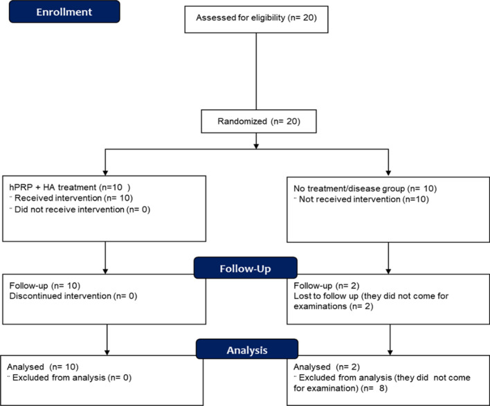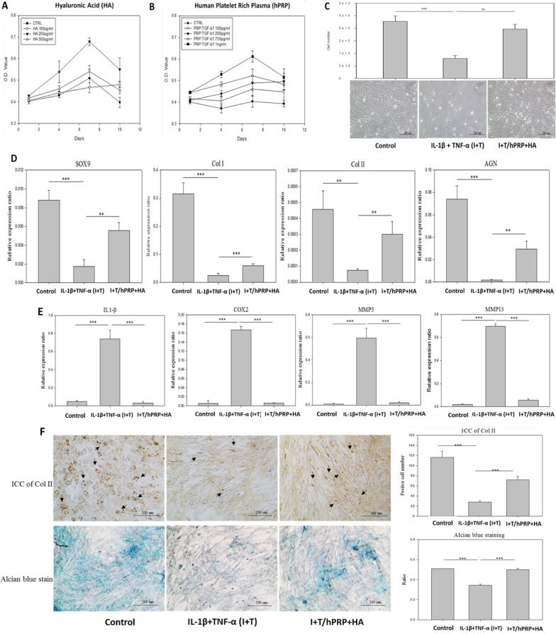 Method: Herein, hPRP was prepared, and the hPRP/HA combined concentration was optimized by MTT assay. For the clinical trial in dish, pro-inflammatory-induced in-vitro and in-vivo mimic 3D TMJ-OA models were created, and proliferation, gene expression, alcian blue staining, and IHC were used to evaluate chondrocyte regeneration. For the animal studies, complete Freund's adjuvant (CFA) was used to induce the TMJ-OA rat model, and condyle and disc regeneration were investigated through MRI. For the clinical trial in humans, 12 patients with TMJ-OA who had disc displacement and pain were enrolled. The disc displacement and pain at baseline and six months were measured by MRI, and clinical assessment, respectively.