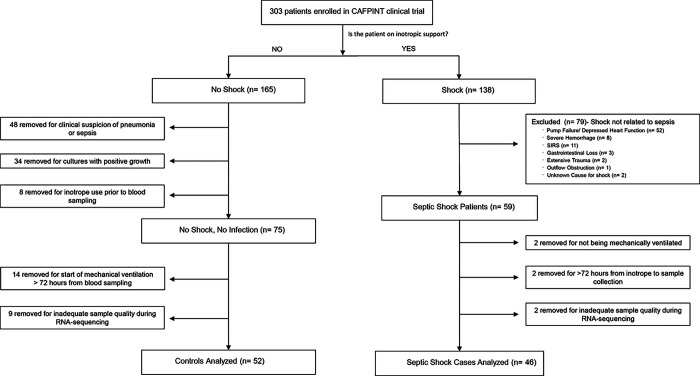 Methods: The subjects were critically ill children with cardiopulmonary failure who were a part of a prospective randomized insulin titration trial to treat hyperglycemia. Genome-wide expression profiling was conducted using RNA-sequencing from whole blood samples obtained from 46 children with septic shock and 52 mechanically ventilated noninfected controls without shock. Patients with septic shock were allocated to subclasses based on hierarchical clustering of gene expression profiles, and we then compared clinical characteristics, plasma inflammatory markers, cell compositions using GEDIT, and immune repertoires using Imrep between the two subclasses.