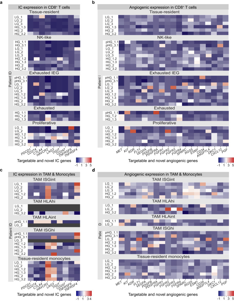 Perioperative immune checkpoint inhibitor (ICI) trials for intermediate high-risk clear cell renal cell carcinoma (ccRCC) have failed to consistently demonstrate improved patient outcomes. These unsuccessful ICI trials suggest that the tumour infiltrating immunophenotypes, termed here as the immune cell types, states and their spatial location within the tumour microenvironment (TME), were unfavourable for ICI treatment. Defining the tumour infiltrating immune cells may assist with the identification of predictive immunophenotypes within the TME that are favourable for ICI treatment. To define the immunophenotypes within the ccRCC TME, fresh para-tumour (pTME, n = 2), low-grade (LG, n = 4, G1-G2) and high-grade (HG, n = 4, G3-G4) tissue samples from six patients with ccRCC presenting at a tertiary referral hospital underwent spatial transcriptomics sequencing (ST-seq). Within the generated ST-seq datasets, immune cell types and states, termed here as exhausted/pro-tumour state or non-exhausted/anti-tumour state, were identified using multiple publicly available single-cell RNA and T-cell receptor sequencing datasets as references. HG TMEs revealed abundant exhausted/pro-tumour immune cells with no consistent increase in expression of PD-1, PD-L1 and CTLA4 checkpoints and angiogenic genes. Additional HG TME immunophenotype characteristics included: pro-tumour tissue-resident monocytes with consistently increased expression of HAVCR2 and LAG3 checkpoints; an exhausted CD8+ T cells sub-population with stem-like progenitor gene expression; and pro-tumour tumour-associated macrophages and monocytes within the recurrent TME with the expression of TREM2. Whilst limited by a modest sample size, this study represents the largest ST-seq dataset on human ccRCC. Our study reveals that high-risk ccRCC TMEs are infiltrated by exhausted/pro-tumour immunophenotypes lacking specific checkpoint gene expression confirming that HG ccRCC TME are immunogenic but not ICI favourable.