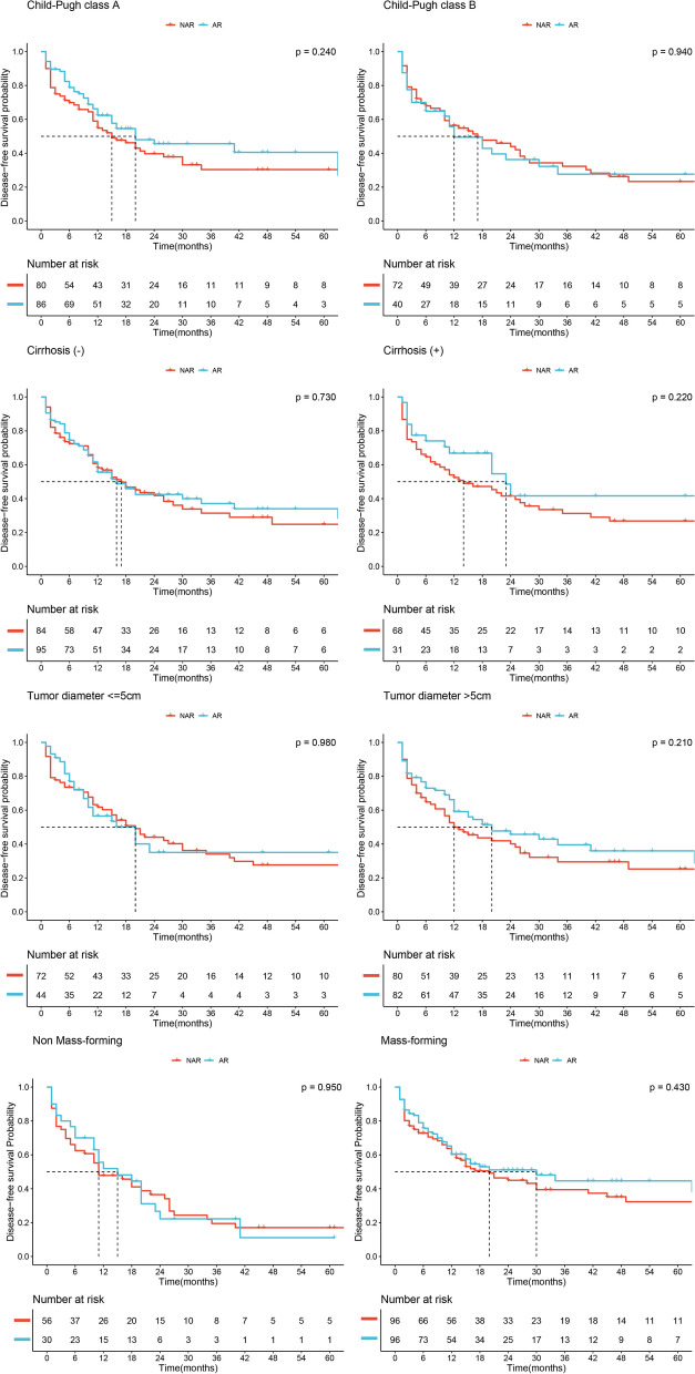 Results: Two hundred seventy-eight ICC patients staged at AJCC I were eligible for this study, including 126 patients receiving AR and 152 patients receiving NAR. Compared to the NAR group, the AR group experienced more intraoperative blood loss before and after PSM or stabilized IPTW (all P > 0.05); AR group also experienced more intraoperative transfusion after stabilized IPTW (P > 0.05). In terms of disease-free survival (DFS) and overall survival (OS), no significant differences were observed between the two groups before and after PSM or stabilized IPTW (all P > 0.05). Multivariable Cox regression analyses found that AR was not an independent prognostic factor for either DFS or OS (all P > 0.05). Further analysis also showed that the survival benefit of AR was not found in any subgroup stratified by Child-Pugh grade (A or B), cirrhosis (presence or absence), tumor diameter (≤ 5 cm or > 5 cm) and pathological type (mass-forming or non-mass-forming) with all P > 0.05.