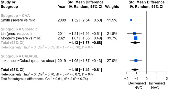 Findings: Of 29 studies (19 case-controls; 10 cohorts), 26 reported decreased NVC with increasing severity of cSVD, of which 18 were individually significant. In 28 studies reporting associations with increasing WMH, 25 reported reduced NVC. Other markers of cSVD were associated with reduced NVC in: eight of nine studies with cerebral microbleeds (six showing a significant effect); three of five studies with lacunar stroke; no studies reported an association with enlarged perivascular spaces. Specific SVD diseases were particularly associated with reduced NVC, including six out of seven studies in cerebral amyloid angiopathy and all four studies in CADASIL. In limited meta-analyses, %BOLD occipital change to a visual stimulus was consistently reduced with more severe WMH (seven studies, SMD -1.51, p < 0.01) and increasing microbleeds (seven studies, SMD -1.31, p < 0.01).