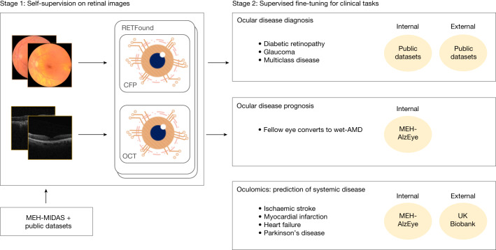 Medical artificial intelligence (AI) offers great potential for recognizing signs of health conditions in retinal images and expediting the diagnosis of eye diseases and systemic disorders1. However, the development of AI models requires substantial annotation and models are usually task-specific with limited generalizability to different clinical applications2. Here, we present RETFound, a foundation model for retinal images that learns generalizable representations from unlabelled retinal images and provides a basis for label-efficient model adaptation in several applications. Specifically, RETFound is trained on 1.6 million unlabelled retinal images by means of self-supervised learning and then adapted to disease detection tasks with explicit labels. We show that adapted RETFound consistently outperforms several comparison models in the diagnosis and prognosis of sight-threatening eye diseases, as well as incident prediction of complex systemic disorders such as heart failure and myocardial infarction with fewer labelled data. RETFound provides a generalizable solution to improve model performance and alleviate the annotation workload of experts to enable broad clinical AI applications from retinal imaging.