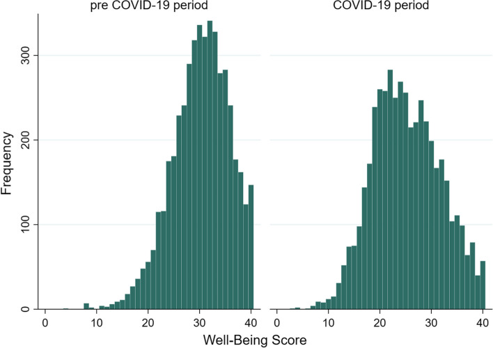 Results: A total of 4863 families participated. The children's WBS decreased during COVID-19 (median value from 31 to 25; p = 0.000). The most statistically significant variables related to a worsening children's WBS were: time of school closure, female gender, living in a house with only a small and unliveable outdoor area, high parents' educational level and worsening financial situation.