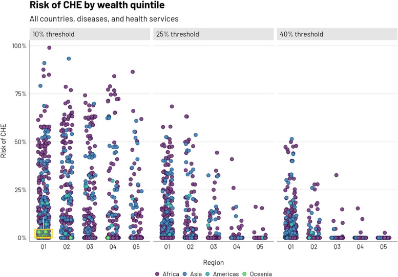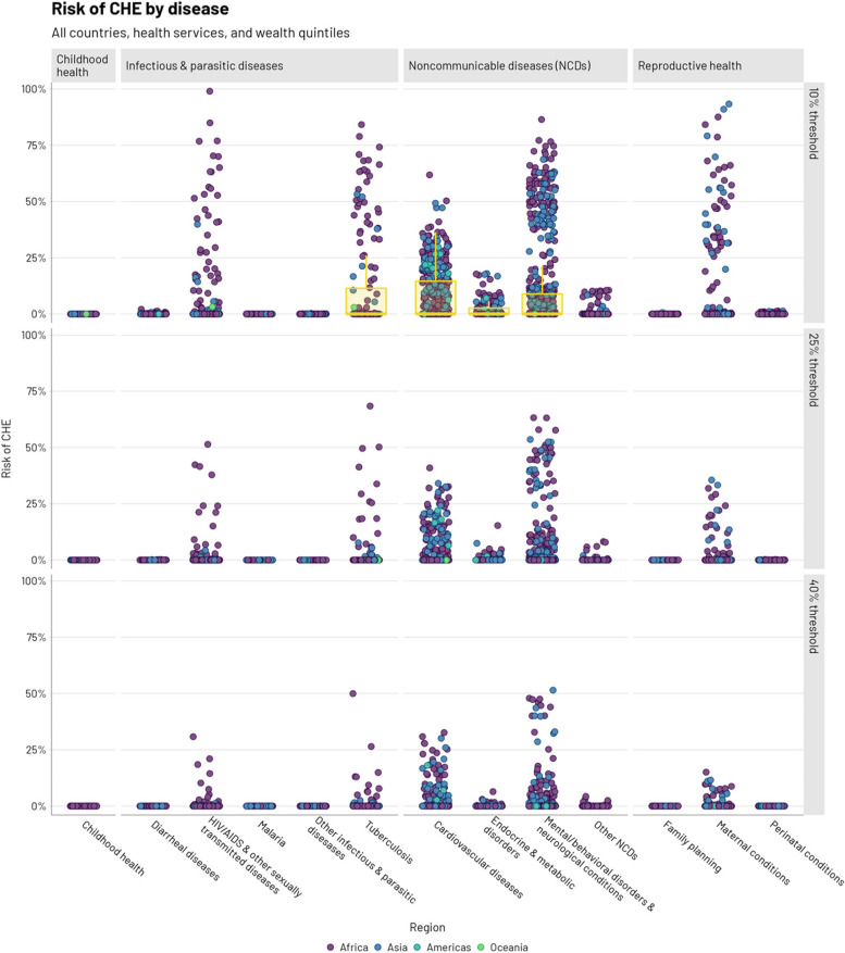 Results: Across all countries, diseases, and health services, the risk of CHE (conditional on having a disease) would be concentrated among poorer quintiles (6.8% risk in quintile 1 vs. 1.3% in quintile 5 using a 10% CHE threshold). The risk of CHE would be higher for a few disease areas, including cardiovascular disease and mental/behavioral disorders (7.8% and 9.8% using a 10% CHE threshold), while lower risks of CHE were observed for lower cost services.