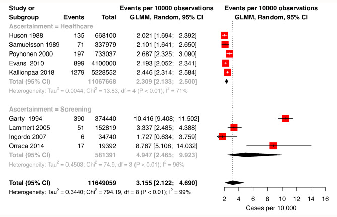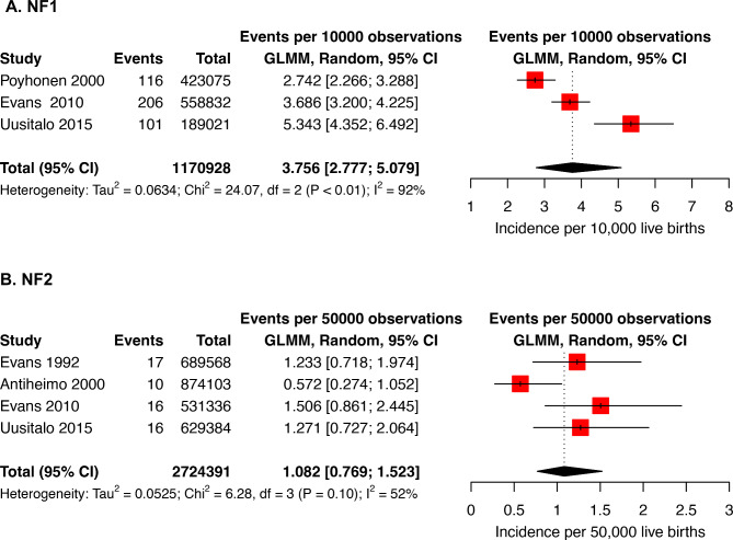 Study design: We conducted a systematic search of NF1 and NF2 incidence or prevalence studies, in OVID Medline, OVID Embase, Web of Science, and Cinahl. Studies were appraised with the Joanna Briggs Institute Prevalence Critical Appraisal tool. Pooled incidence and prevalence rates were estimated through random-effects meta-analysis.