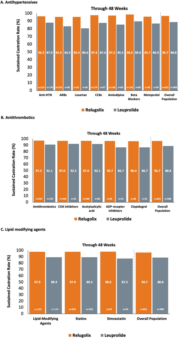 Results: Antihypertensives, antithrombotics, and LMAs were utilized by 52.7%, 39.1%, and 39.6% of men in HERO, respectively. In the main subgroups, point estimates for sustained castration rates were generally consistent with overall estimates of relugolix and leuprolide observed in the overall population. Sustained castration rates were also mostly consistent for men taking the most common drug classes and individual agents in each class (losartan [n = 103]: relugolix, 95.4% vs leuprolide, 80.6%; amlodipine [n = 229]: 97.2% vs 85.5%; metoprolol [n = 88]: 95.7% vs 86.9%; acetylsalicylic acid [n = 259]: 97.0% vs 92.1%; clopidogrel [n = 43]: 96.4% vs 86.7%; simvastatin [n = 78]: 98.0% vs 87.3%). Incidence and types of adverse events (AEs) among men who received these medications were mostly consistent with overall population results, with some increases in grade ≥ 3 and fatal AEs.